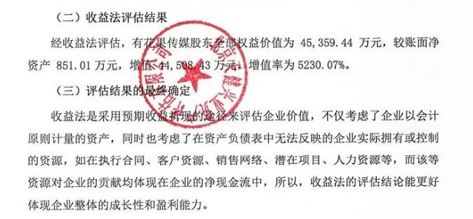 根据北京天健兴业资产评估出具的评估报告,按照收益法评估,有花果传媒股东全部权益价值为4.54亿元,增值率高达5260.07%。