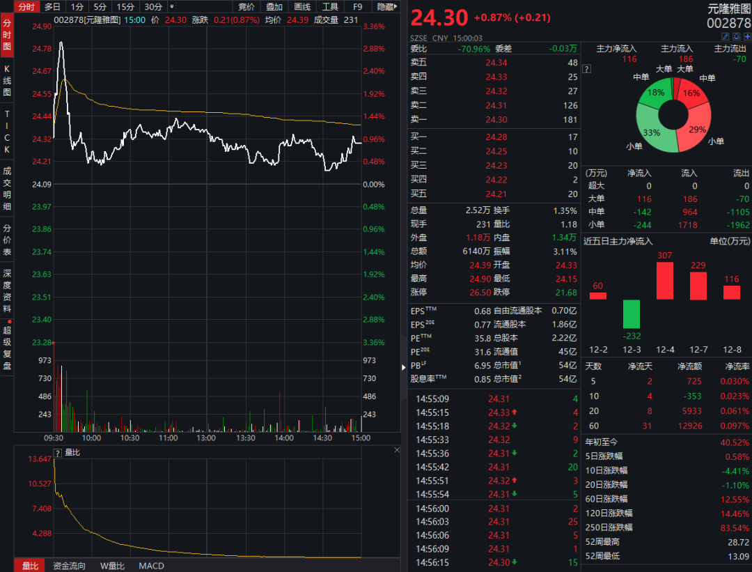 不过,这样的利好消息,并未给元隆雅图带来股价上的明显反弹。12月8日,元隆雅图当日以24.30元/股报收,涨幅为0.87%。