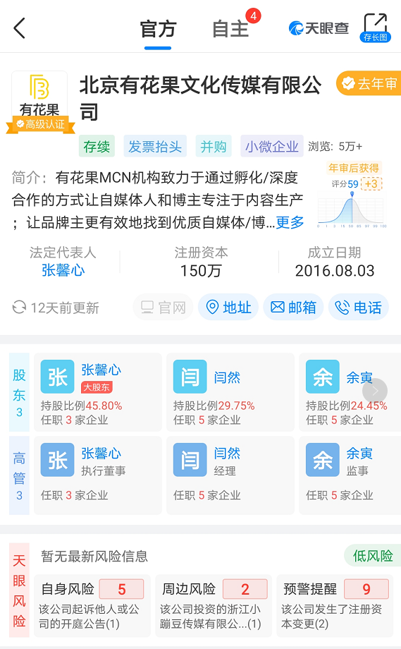 公开信息显示,有花果传媒成立于2016年8月,注册资本为150万元,法定代表人为张馨心。张馨心在公司中任执行董事,两名合伙人则分别任经理和监事。
