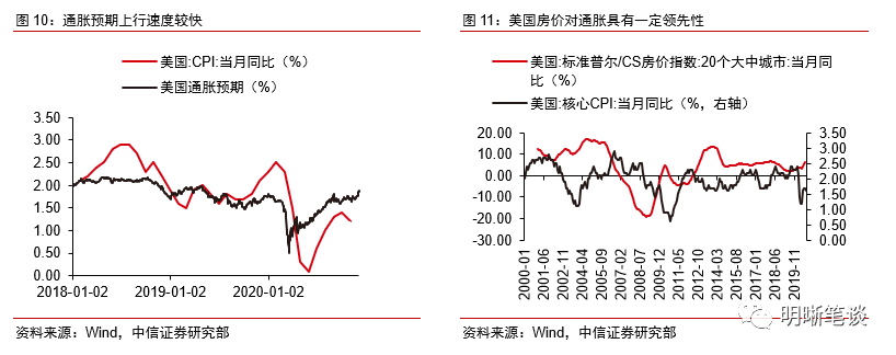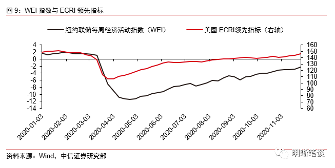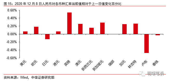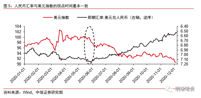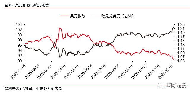 但对于美元指数来说,我们认为明年在基本面因素和美联储货币政策的影响下,美元指数可能获得支撑,因此人民币受到美元走弱带来的升值压力或也将有所减轻。对于美元指数而言,虽然当前美元指数正处于持续走弱的过程当中,但我们认为明年美元指数可能获得支撑。做出这种判断的理由主要出于两点原因,一方面根据纽约联储每周更新的经济活动指数(WEI指数)以及美国ECRI领先指标,当前美国经济正处于边际修复的进程当中。而从疫苗的研发进展来看,近期有关新冠疫苗的积极消息逐渐增多,因此明年随着美国经济逐渐复苏美元或受到基本面因素的支撑。另一方面,美联储货币政策未来如何演变同样值得关注。目前拜登上台出任下一届美国总统已成大概率事件,虽然拜登对于防控疫情以及修复由疫情带来的经济问题非常重视,而疫情当中的经济修复需要货币政策与财政政策的共同发力,短期来看美联储的货币政策仍将以宽松的基调为主。但对于稍远的时间,目前美国通胀预期上行的速度较快,同时从房价的角度当前美国房地产行业表现亮眼,房价上涨较多,美国房价对于通胀而言也具有一定的领先性。考虑到后续美国经济复苏脚步加快叠加可能到来的通胀影响,美联储货币宽松的脚步或将出现放慢收敛。结合以上两点原因,我们认为明年在基本面因素和美联储货币政策的影响下,美元指数可能获得支撑,因此人民币受到美元走弱带来的升值压力或也将有所减轻。