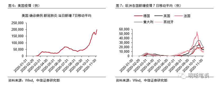 从当前部分医药公司给出的疫苗产能预计情况来看,虽然疫苗产能相较全球疫苗接种需求而言仍不足够,考虑到发达经济体在获取疫苗方面具有优势,预计明年上半年如欧美等发达经济体或能完成第一阶段疫苗接种,因此我们预计下半年欧美经济体经济复苏脚步或有所加快。根据部分医药公司披露的新冠疫苗研发进展和产能预计情况,年底之前如Moderna以及BioNTech、辉瑞和复星生产的疫苗或将投入生产,而2021年将有多款疫苗投产。但从疫苗产能相较全球疫苗接种需求的角度,疫苗产能在明年仍旧不足。考虑到发达经济体抢先预定了2021年初的大部分疫苗产量,同时如美国等还通过协议享受疫苗供应的优先权,我们预计明年上半年如欧美等发达经济体或能完成第一阶段重点人群的疫苗接种,因此我们预计下半年欧美经济体经济复苏的脚步或将有所加快。