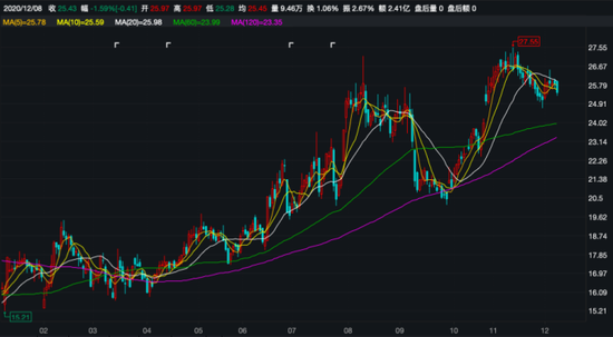 截至2020年12月8日,汤臣倍健报收于25.43元/股,较近期高点回落7.7%,PE为39.7倍,市值为402亿元。