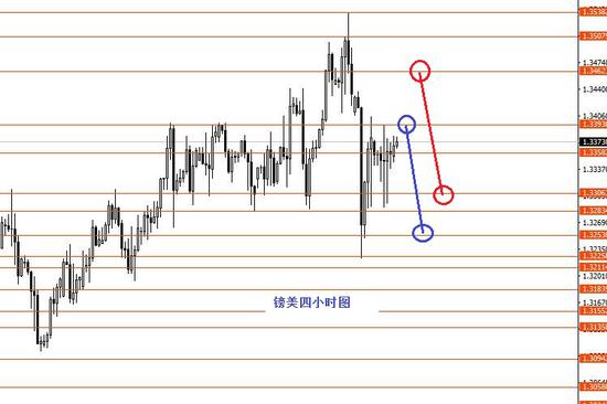 英镑周一直接下行,最低1.3225比预期目标1.3310还低。从图形来看,周一下跌后反弹震荡,本周继续按高位震荡格局操作,后市主方向暂时不定,然后走一步看一步,今日上方关注1.3460阻力,下方关注1.3310支撑。今日短线操作建议:1.3460附近做空,止损1.3550,目标看向1.3390和1.3310区域。控制仓量,严格止损。