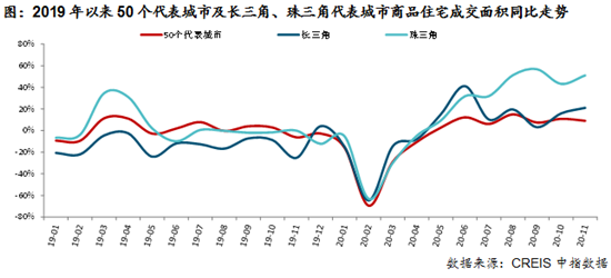 疫情后长三角市场率先恢复,珠三角后期发力,市场规模持续领先增长。2020年1-11月重点城市商品住宅成交面积降幅收窄,其中长三角及珠三角地区代表城市整体规模同比分别增长5.5%、20.7%,是支撑50城市场规模的主要力量。其中长三角地区受益于疫情后供需两端支持性政策落地更早,3月起市场规模恢复幅度即较为突出,直至6月,同比增幅均明显领先于50城及珠三角地区;下半年,受区域内热点城市调控持续收紧影响,加之压制需求高位释放后支撑度减弱,长三角同比领先优势不再突出。而珠三角地区核心城市调控虽也有收紧,但深圳城市规划定位高,新房资源稀缺,供应大幅放量带动需求积极入市,加之随着深圳、东莞调控收紧,广州区域人才政策的放松吸引置业需求积极流入,下半年以来珠三角地区代表城市商品住宅成交规模同比增幅持续领先于50城整体及长三角30个百分点左右,短期市场活跃度较高。