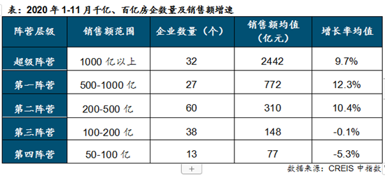 TOP100房企销售业绩逐渐回升,各阵营销售业绩表现分化。2020年1-11月,TOP100房企销售额均值为1128.2亿元,销售额增长率均值为12.0%。1000亿以上超级阵营共32家,销售额增长率均值为9.7%。第一阵营(500-1000亿)共27家,销售额增长率均值为12.3%;第二阵营(200-500亿)有60家企业,销售额增长率均值为10.4%;第三阵营(100-200亿)共38家,销售额增长率均值为-0.1%;第四阵营共13家,销售额增长率均值为-5.3%。