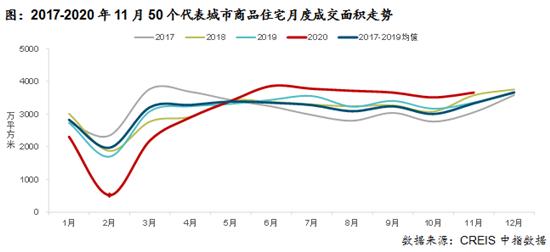 2020年重点城市商品住宅成交面积同比小幅调整,整体规模接近前三年平均水平。据初步统计,2020年1-11月,50个代表城市商品住宅月均成交面积约3044万平方米,处于2015年以来同期最低位,但同比降幅已收窄至2%,整体规模接近前三年平均水平。分季度来看,一季度在新冠肺炎疫情冲击下,商品住宅市场交易量明显缩减;二季度起,疫情快速缓和、中央及地方采取的各项支持政策开始显现成效,加之房企积极营销,压制需求恢复释放,带动市场规模持续回升。单月来看,50城商品住宅成交面积5月起同比保持正增长态势,绝对规模赶超前三年平均水平,市场持续恢复。