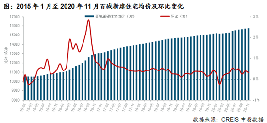 城新建住宅价格累计上涨3.19%,涨幅较去年同期扩大0.28个百分点。一季度受疫情影响新建住宅价格累计涨幅较去年同期明显收窄,二季度以来随着疫情影响逐步减弱,各季度累计涨幅较去年同期均有所扩大,二、三季度累计涨幅均在1%以上,10-11月价格累计上涨0.72%,较去年同期扩大0.36个百分点。单月来看,2020年11月,百城新建住宅均价15755元/平方米,同比上涨3.63%,涨幅较10月扩大0.11个百分点;环比上涨0.32%,较10月收窄0.08个百分点,涨幅连续41个月在0.6%以内,维持在低位区间,整体价格平稳运行。