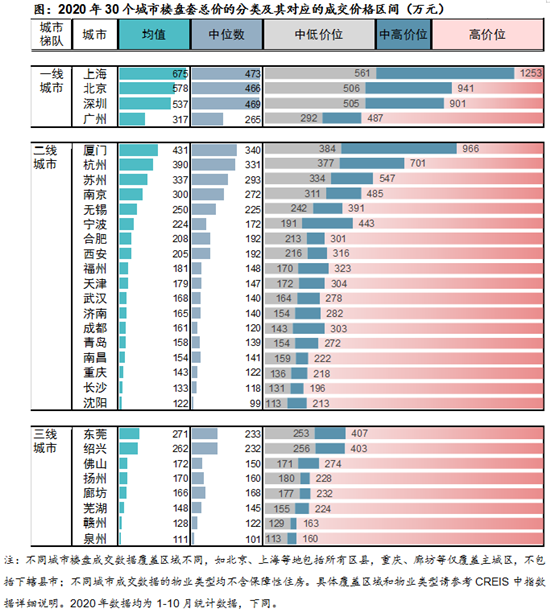 基于套总价、结合成交量,我们将30个城市不同层次的楼盘分为三类:中低价位、中高价位、高价位,具体划分方式为:首先根据套总价对所有新房楼盘进行降序排列,成交量占前10%的属于高价位楼盘,10%-40%属于中高价位楼盘,后60%属于中低价位楼盘。