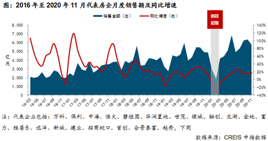 代表企业销售业绩增速有所放缓。2020年1-11月,20家品牌房企累计销售金额5.4万亿元,同比增长9.0%;累计销售面积4.0亿平方米,同比增长10.7%,增速较去年同期分别收窄6.6和3.9个百分点。3月以来,随着疫情得到控制及复工复产的有序推进,市场情绪有所恢复,上半年代表房企销售业绩与去年同期基本持平。7月以来,房企加快推盘和营销力度,预计在冲刺全年销售目标下,代表企业整体销售规模仍将保持稳定增长。