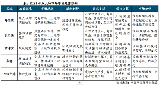 综合对五大城市群房地产市场现状、调控政策、发展规划前景与供需两端支撑所做的分析,及对2021年宏观环境的预判,我们对2021年五大城市群市场趋势做出如下判断。