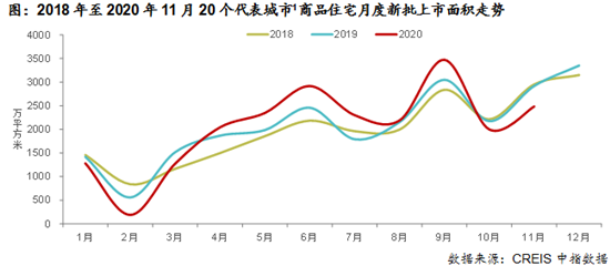 2020年重点城市整体供应规模略高于去年同期。据初步统计,2020年1-11月,20个代表城市商品住宅月均新批上市面积约2044万平方米,同比增长约3%。短期库存来看,可售面积稳步提升,短期库存规模及去化时间均提升至近年高位。据统计,截至2020年10月底,20个代表城市商品住宅可售面积提升至2.2亿平方米以上,短期库存规模较2019年末增长11.4%。按近12个月的平均销售速度计算,截至10月底,20个代表城市短期库存去化时间为11.9个月,较2019年末延长1.9个月。当前,代表城市短期库存规模及去化时间已提升至近年高位,但整体仍处合理区间。