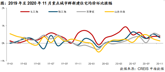 从各梯队城市表现来看,一线城市疫情下表现出较强韧性,疫情后市场快速回温,2020年1-11月一线城市价格累计上涨3.77%,在各梯队城市中涨幅最大,较去年同期扩大3.43个百分点。二线部分城市政策收紧后,市场降温,1-11月二线城市价格累计上涨3.32%,较去年同期收窄1.13个百分点。三四线代表城市价格累计上涨2.26%,涨幅较去年同期收窄1.52个百分点,收窄幅度在各梯队城市中最大。从各城市群来看,2020年1-11月长三角、珠三角新建住宅价格累计涨幅较去年同期均明显扩大,其中长三角累计涨幅为近四年同期最高水平。