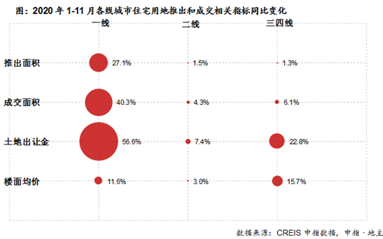 土地市场整体推地节奏有所加快,住宅用地供求小幅增长,出让金增长近两成。据初步统计,2020年1-11月,全国300城住宅用地推出11.1亿平方米,同比增长2.2%;成交9.3亿平方米,同比增长6.3%;住宅用地出让金为4.4万亿元,同比增长17.8%。