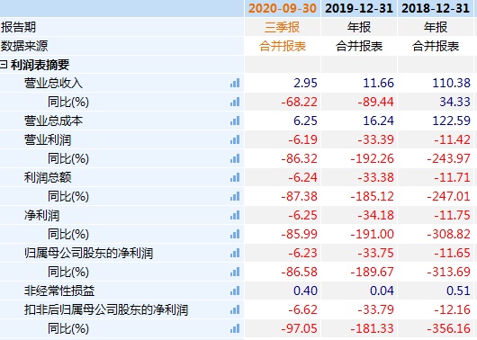 连续的利空消息出炉让公司的股价陷入了萎靡,不仅存在了面值退市之忧,且从公司近几年的业绩变化来看,还因连续亏损而眼下存在暂停上市的可能性。Wind数据显示,2018年以来,公司的营收业绩出现了持续下滑情况,不仅营收由2018年110亿元下降到今年三季报的2.95亿元,且业绩也是持续亏损,其中,2018和2019年分别亏损了11.65元和33.75亿元,而今年前三季度则亏损了6.23亿元。如此情况意味着,若公司在今年四季度不能实现超过6.23亿元的盈利,则将面临因连续亏损而暂停上市风险。
