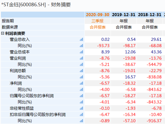 同样可能因连续亏损且股价持续低迷而游走在退市边缘的还有*ST金钰,不仅在2018年、2019年相继亏损了17.18亿元和18.27亿元,且今年以来同样出现亏损,前三季度的亏损金额高达6.57亿元。如此情况下,若年末业绩不能实现反转,则将暂停上市。