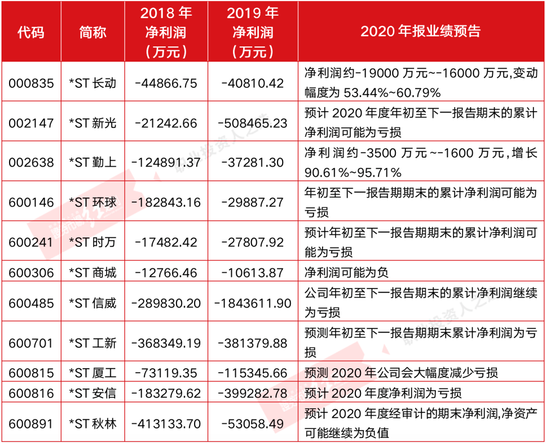 此外,两市目前还有10家公司在2018年、2019年连续亏损后,今年年报预告再次发出亏损的警示,若年内无法扭亏,则公司将因连续亏损而暂停上市,若业绩进一步恶化,则将直接退市。