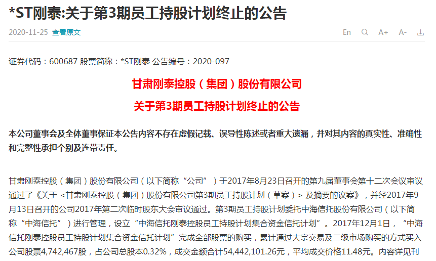 也就在当晚,上市公司还发布了另一重大利空消息:11月23日,公司收到中海信托邮件通知,鉴于劣后级信托单位已经全部罚没,中海信托按照惟一受益人优先委托人指令办理后续变现与信托终止事宜。截至目前,“中海信托刚泰控股员工持股计划集合资金信托计划”所持有的公司股票已全部出售,因此,公司第3期员工持股计划已终止。