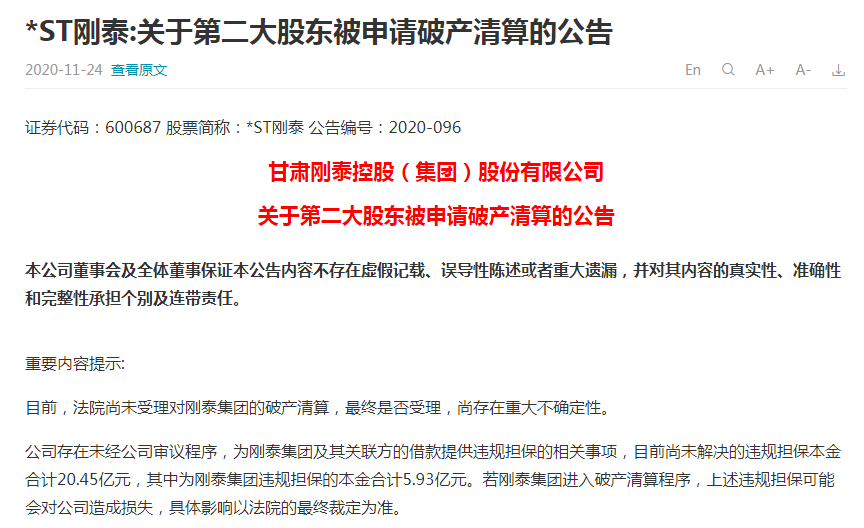 在11月23日晚间,*ST刚泰第二大股东刚泰集团被国信证券股份有限公司以不能清偿到期债务且明显缺乏清偿能力为由,向上海市第三中级人民法院申请对刚泰集团进行破产清算。值得注意的是,上市公司为刚泰集团及其关联方尚未解决的违规担保合计高达20.45亿元,其中为刚泰集团违规担保的本金就合计5.93亿元。受此爆炸性利空打击,12月24日,*ST刚泰股价在开盘后不久即封死跌停,且跌破了1元面值。