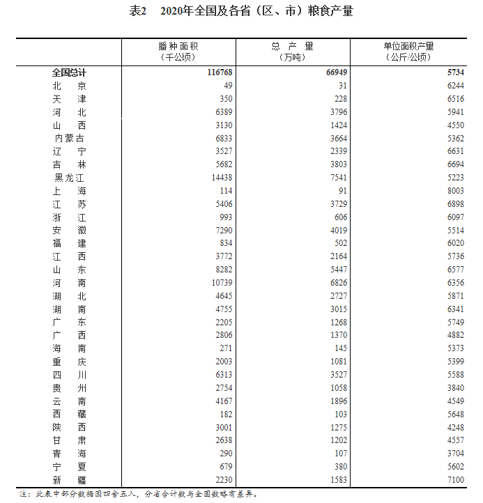 中国网财经12月10日讯 据国家统计局官网消息,根据对全国31个省(区、市)的抽样调查和农业生产经营单位的全面统计,2020年全国粮食播种面积、单位面积产量、总产量如下: