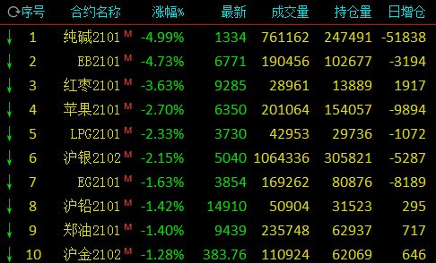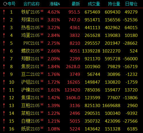 热点栏目12月10日,国内期市早盘分化明显,铁矿石大涨近5%,次主力合约一度冲上1000元关口,动力煤涨近4%,热卷涨逾3%,螺纹涨近3%;能化品分化,PVC涨近3%,甲醇涨逾2%,纯碱跌近5%,盘中一度跌停,苯乙烯跌近5%;农产品中,鸡蛋涨近3%,豆二涨近2%,红枣跌近4%,苹果跌近3%;贵金属均下跌。