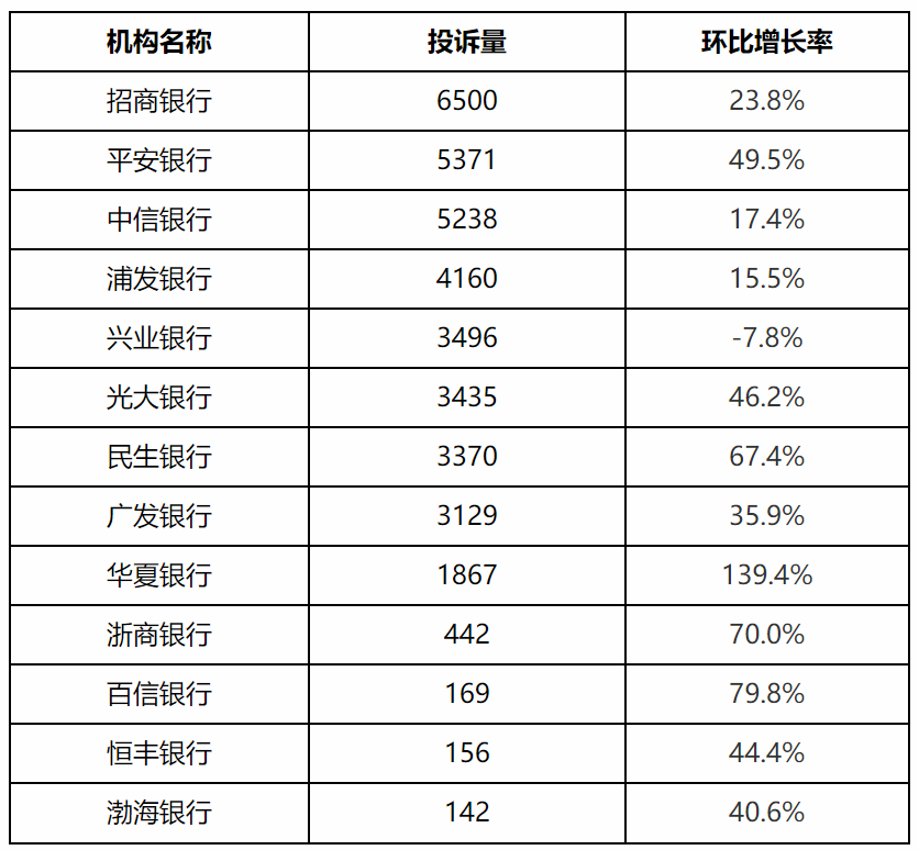 投诉总量排行榜是:工商银行、建设银行、交通银行、招商银行、平安银行、中信银行;涉及信用卡业务投诉排行榜为:交通银行、建设银行、工商银行,招商银行、中信银行、平安银行;涉及个人贷款业务投诉排行榜为:工商银行、农业银行、中国银行、平安银行、招商银行、光大银行;涉及理财类业务投诉排行榜为:邮储银行、工商银行、建设银行、浦发银行、平安银行、招商银行。