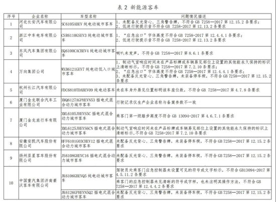 (二)新能源客车,共涉及10家企业的12个车型产品,涉及低速行驶提示音、车辆喇叭、三角警告牌、标志标识等项目不符合国家标准或管理规定。
