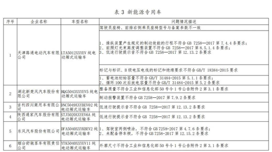 (三)新能源专用车,共涉及6家企业的6个车型产品,涉及动力电池容量、报警信号、低速行驶提示音、标志标识等项目不符合国家标准或管