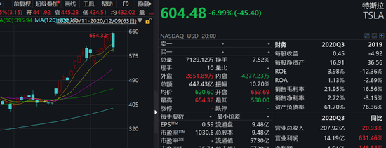 截至12月9日收盘,特斯拉跌6.99%,报604.48美元。