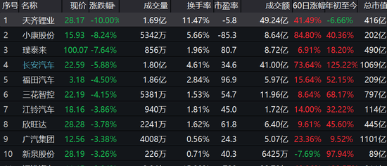 12月10日A股,新能源汽车指数板块收跌1.16%,个股方面,天齐锂业跌停,小康股份大跌8%,福田汽车、亚星客车、北汽蓝谷跌超4%,比亚迪、广汽集团等个股纷纷下挫。