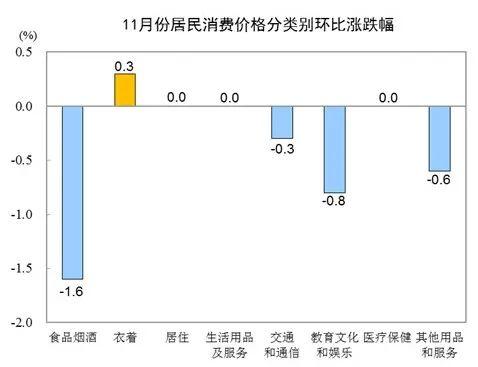 11月份,全国居民消费价格环比下降0.6%。其中,城市下降0.6%,农村下降0.6%;食品价格下降2.4%,非食品价格下降0.1%;消费品价格下降0.8%,服务价格下降0.4%。