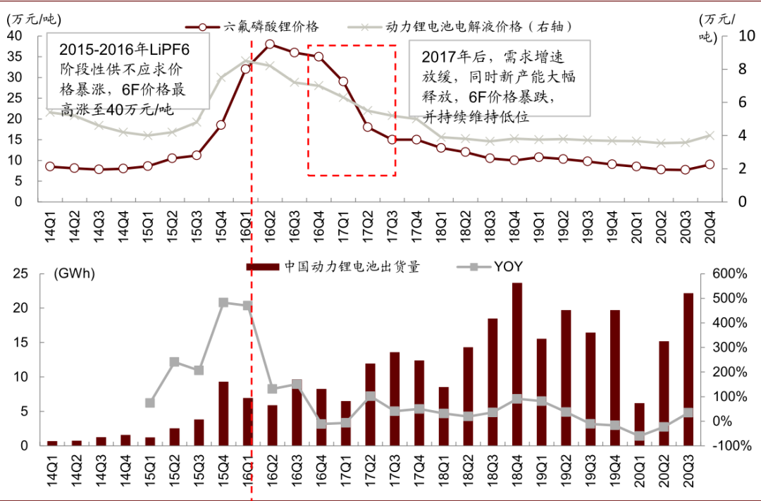 ► 2014-2016新能源汽车需求爆发,LiPF6价格暴涨:2014年起全球新能源车市场放量,动力电池装机量首次突破10GWh,2015、2016年动力电池装机量继续高增长,同比增长均超100%。动力电池快速放量带动六氟需求大涨,同时受制于六氟产能投放周期较长,六氟出现阶段性供不应求,价格从底部8万元/吨最高涨至超40万元/吨,同时推动电解液价格从4万元/吨涨至超8万元/吨。