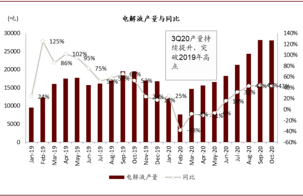 3Q20全球新能源车均迎增长拐点,电解液需求增长提速,LiPF6有效产能偏紧驱动LiPF6与电解液涨价。