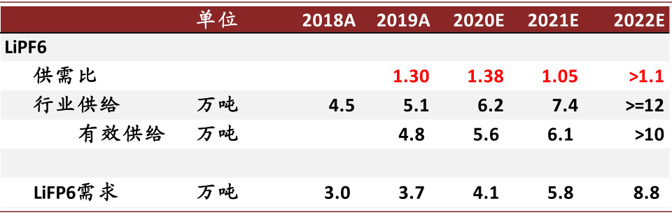 2021年供需紧平衡,2022年供需缓解。我们预期在2021年新能源汽车市场需求继续放量情况下,六氟磷酸锂将维持供需紧平衡状态,到2022年,新一批扩产产能将逐步释放,大幅缓解六氟供需关系。
