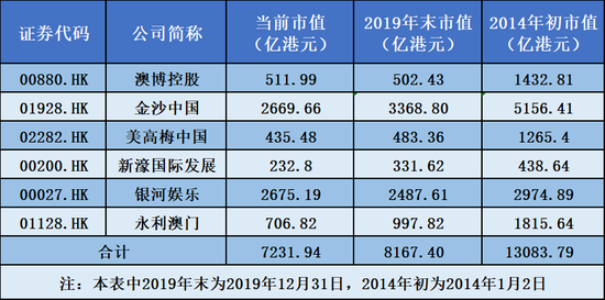 上表中的六家博彩公司是澳门唯六的持有合法牌照的博彩运营商,2014年之后,其总市值一直没能再突破万亿港元的“小目标”。截至2020年11月27日,六家博彩公司市值总和为7231.94亿港元(合人民币6136.3亿元),与2019年末的8167.40亿港元相比,缩水了近一千亿港元,与巅峰时期的1.3万亿港元更是相去甚远。