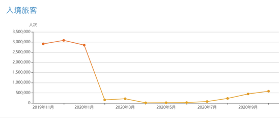 自2月份开始,入境旅客量跌跌涨涨,但直至10月份也没能达到疫情前的量级。