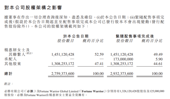 配售事项完成后,杨惠妍持股从52.59%,稀释为49.49%。