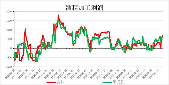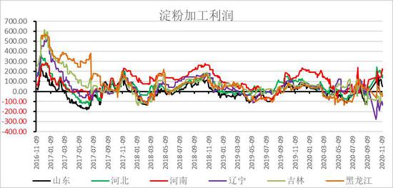 11月淀粉及酒精企业开机逐步回升,主要由于新玉米上市期间,玉米由于供应充裕价格会有一波走弱,深加工企业收潮粮价格相对较低,能趁着上市期间赚取一波利润,所以这段时间深加工开机将逐步提高,并维持相对高位。不过酒精企业开机明显低于去年同期,酒精企业主要分布在东北,受制于原料玉米成本过高,玉米上量有限,企业维持低开机减少玉米用量。目前就加工利润来看,山东淀粉厂加工利润较好,东北由于高价收玉米面临亏损,受疫情影响,淀粉消费仍将低迷,而总体产能维持高位,供过于求,随着玉米成本上移,加工利润将逐步转差。酒精加工利润由于酒精企业整体开机较低,利润好于去年同期,预计后期酒精企业开机提升幅度将加快。