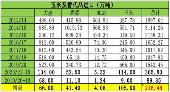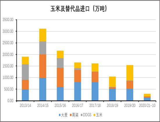 19/20年度进口合计1542.45万吨,同比增加494.52万吨,主要是高粱和玉米进口大幅增加,主要是执行中美一阶段协议,自美进口增加。20/21年度截止10月进口305.83万吨,同比增加216.48万吨,玉米是近期增加进口的主力,在始于9月1日的2020/21年度,中国已经订购约1700万吨美国玉米。展望下年度,进口预计继续增加,主要增量将来自玉米,这取决于国内政策及中美关系下一步的走向。面对明年供应紧缺的担忧,国内饲料企业都在加紧进口国外谷物及替代品。