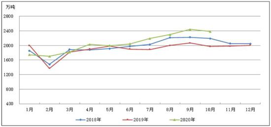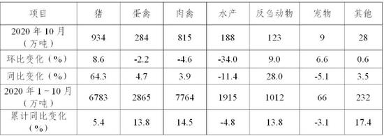 2020年10月饲料总产量2382万吨,环比下降2.4%,同比增长20.9%。从品种看,10月猪饲料产量934万吨,环比增长8.6%,同比增长64.3%,连续5个月同比增长,达到2017年10月的95.3%。蛋禽饲料产量284万吨,同比增长4.7%,环比下降2.2%。肉禽饲料产量815万吨,同比增长3.9%,环比下降4.6%。2020年1~10月,饲料总产量20638万吨,同比增长9.2%。其中,受生猪产能持续恢复拉动,猪饲料产量6783万吨,同比增长5.4%,今年前10个月猪饲料累计产量达到2017年和2018年同期的80%。由于国家鼓励政策及利润的驱动,生猪存栏和母猪存栏已经恢复到正常年份的88%左右,最快明年3月可能就恢复到正常水平,加上禽料继续增加。新年度饲料需求将会有较大幅度增长。