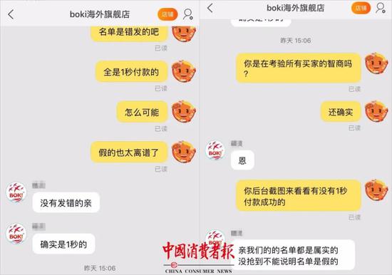 “在双11拥挤情况下,正常来说付款完成应该是十几秒。1000个名额,900多个账号是在1秒内付了尾款,这几乎是不可能的”林先生向记者说到。另一名投诉的消费者石先生向记者提供了与客服的对话截图,对方表示“确实是1秒”。
