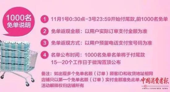 活动介绍称“11月1号0:30点—3号23:59开始付尾款,前1000名免单”“免单返金额:以用户实际订单支付金额为准”......