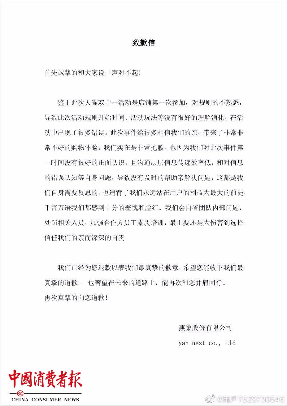 《致歉信》称“店铺第一次参加,对规则的不熟悉,导致此次活动规则开始时间、活动玩法等没有很好的理解消化,在活动中出现了很多错误”“我们会自省团队内部问题,处罚相关人员,加强合作方人员素质培训”......