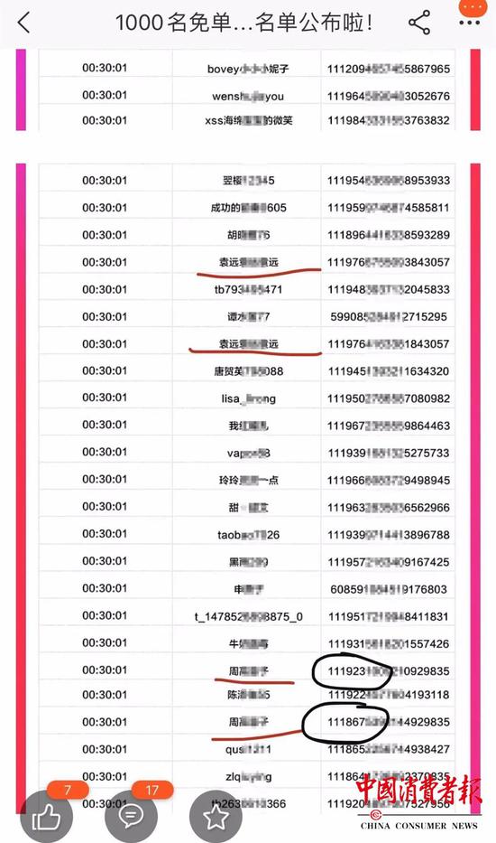 你公布的1000名免单消费者名单