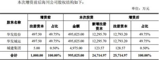 根据公告,该次增资完成后,华发股份对海川公司的持股比例没变,依然为49.75%。