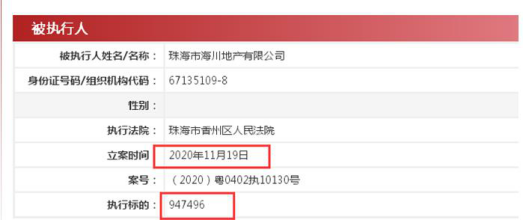中国执行信息公开网显示,珠海市海川地产有限公司于今年11月19日被珠海市香洲区人民法院列为被执行人,执行标的为947496。