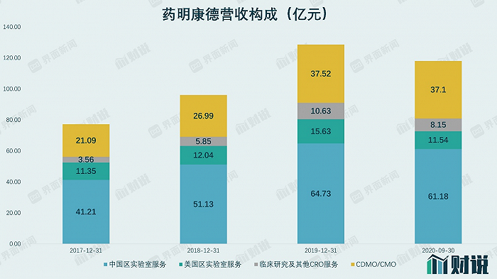 图片来源:天风证券财报显示,2019年药明康德来自CRO业务收入90.9亿元,占比约7成,来自CDMO/CMO业务收入37.52亿元,占比约3成。具体来看,又分为中国区实验室服务、美国区实验室服务、CDMO/CMO、临床研究及其他CRO服务四个自板块。
