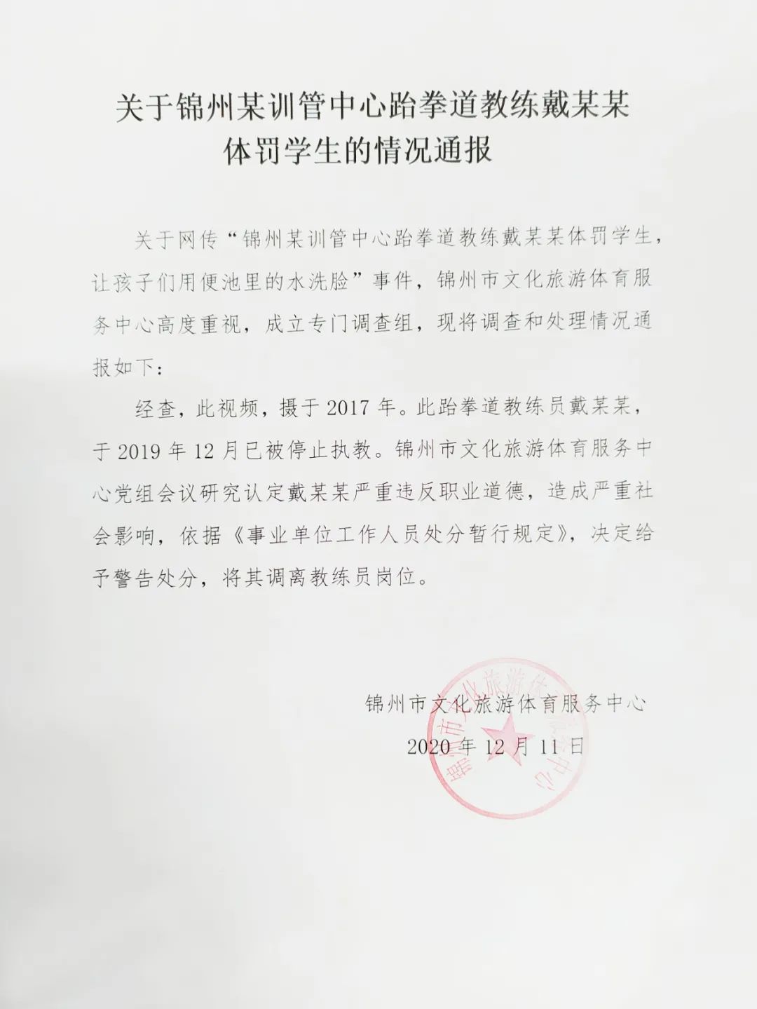 原标题:官方通报“锦州跆拳道教练体罚学生”:警告处分,调离岗位