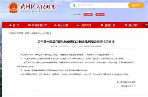 黄冈市黄州区人民政府网站发布《关于黄州区居民网购涉疫进口冷链食品后续处置情况的通报》,表示将撤销对居民个人的行政处罚和200元罚款,并就此事致歉。