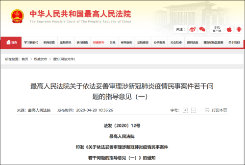 今年4月20日,我国最高人民法院就发布《关于依法妥善审理涉新冠肺炎疫情民事案件若干问题的指导意见(一)》。