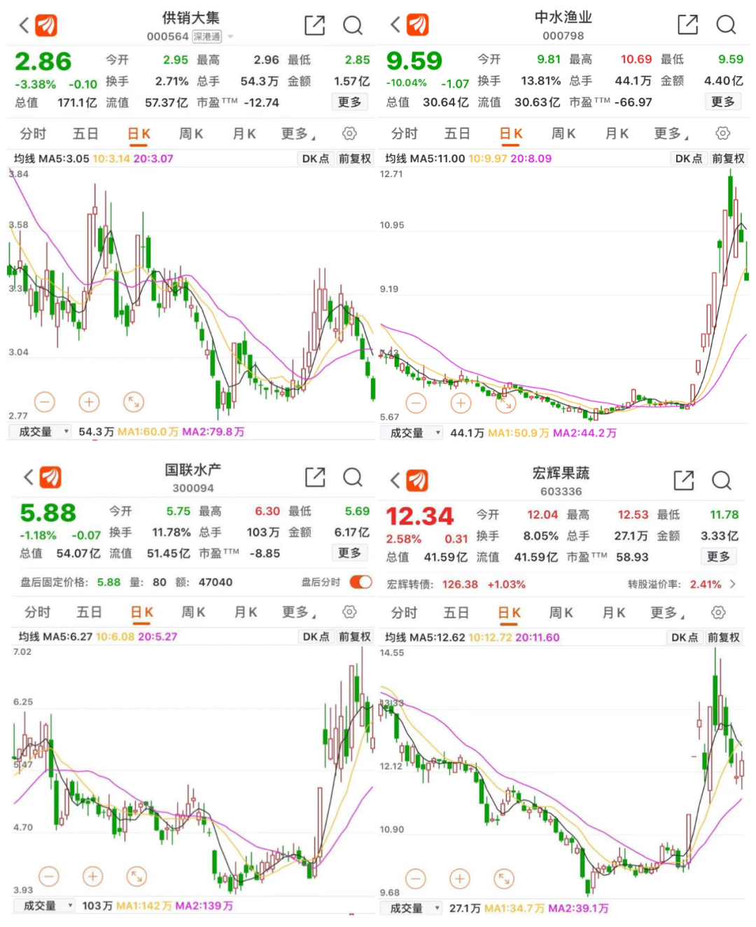其实,社区团购概念股近期也经历了过山车式的大涨大跌。近期,中水渔业、供销大集、国联水产、宏辉果蔬等多只概念股,股价在连续上涨后出现大跌。